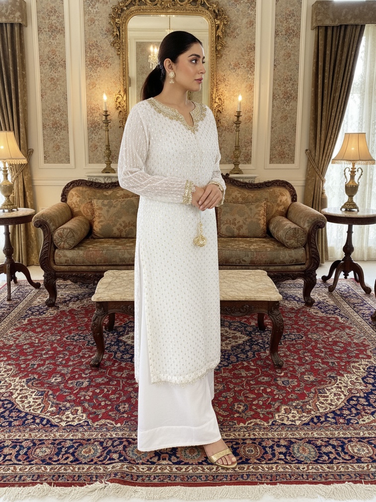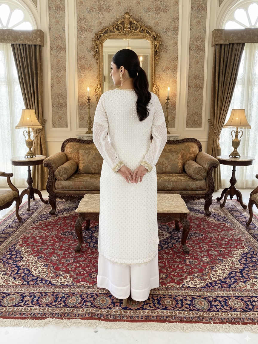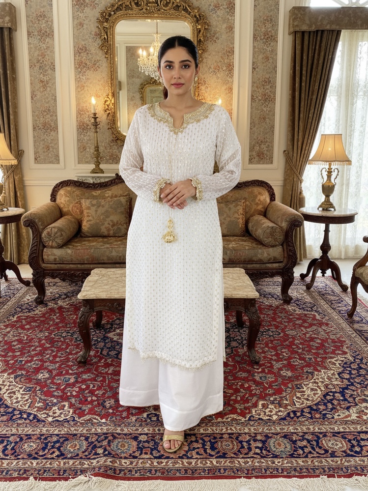 •“An opulent ensemble featuring a full heavy shirt with chic plazo and matching dupatta.”