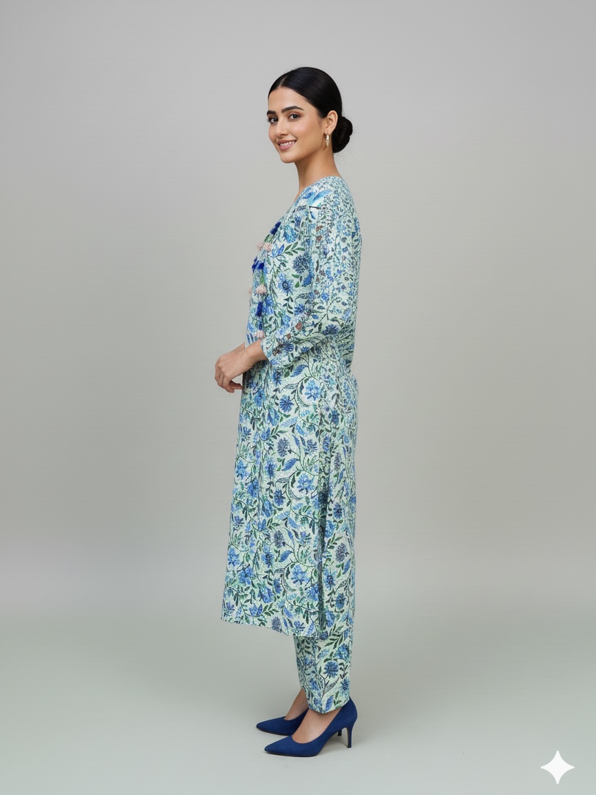This beautiful khaddar 2-piece dress features a soothing blue and green floral print, perfect for winter days. Made with premium quality khaddar fabric, it offers both comfort and style for your everyday wear.